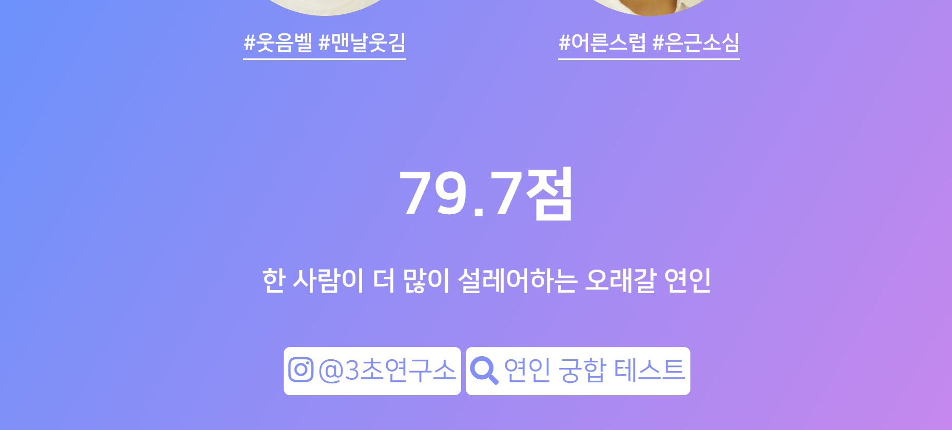 저의 연인 궁합 테스트는 79.7점이 나왔네요. 미소 사진을 넣었더니 웃음벨, 맨날 웃김이 나왔어요. 상대는 살짝 미소를 띄고 있었는데 어른스럽, 은근소심이 나왔습니다. 이 부분 역시 잘 맞췄어요. :)