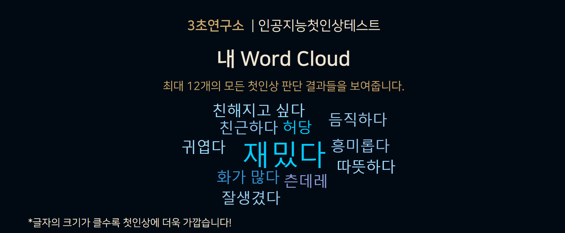 저에 대한 첫인상 판단 결과들을 보여주는데요, 글자의 크기가 클 수록 첫인상에 더욱 가깝다고 합니다. 저는 재밌다 글씨가 가장 크니까 재밌는 사람이 저의 첫인상이겠네요. 하지만 무표정이나 화난 표정으로 테스트한다면 달라지겠지요?