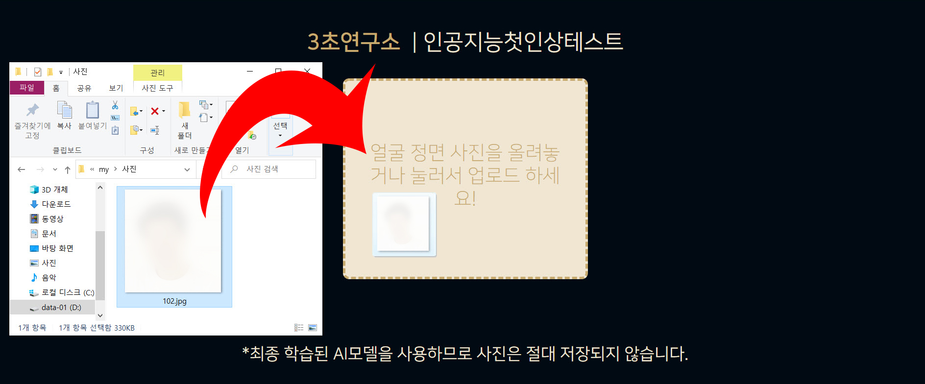 하단으로 스크롤을 내리면 얼굴 정면 사진을 올려놓는 사각형이 보입니다. 클릭해서 업로드 해도 되지만 저는 폴더를 옆에 두어 사진을 드래그 해보니 잠시 후 바로 결과가 나왔습니다.