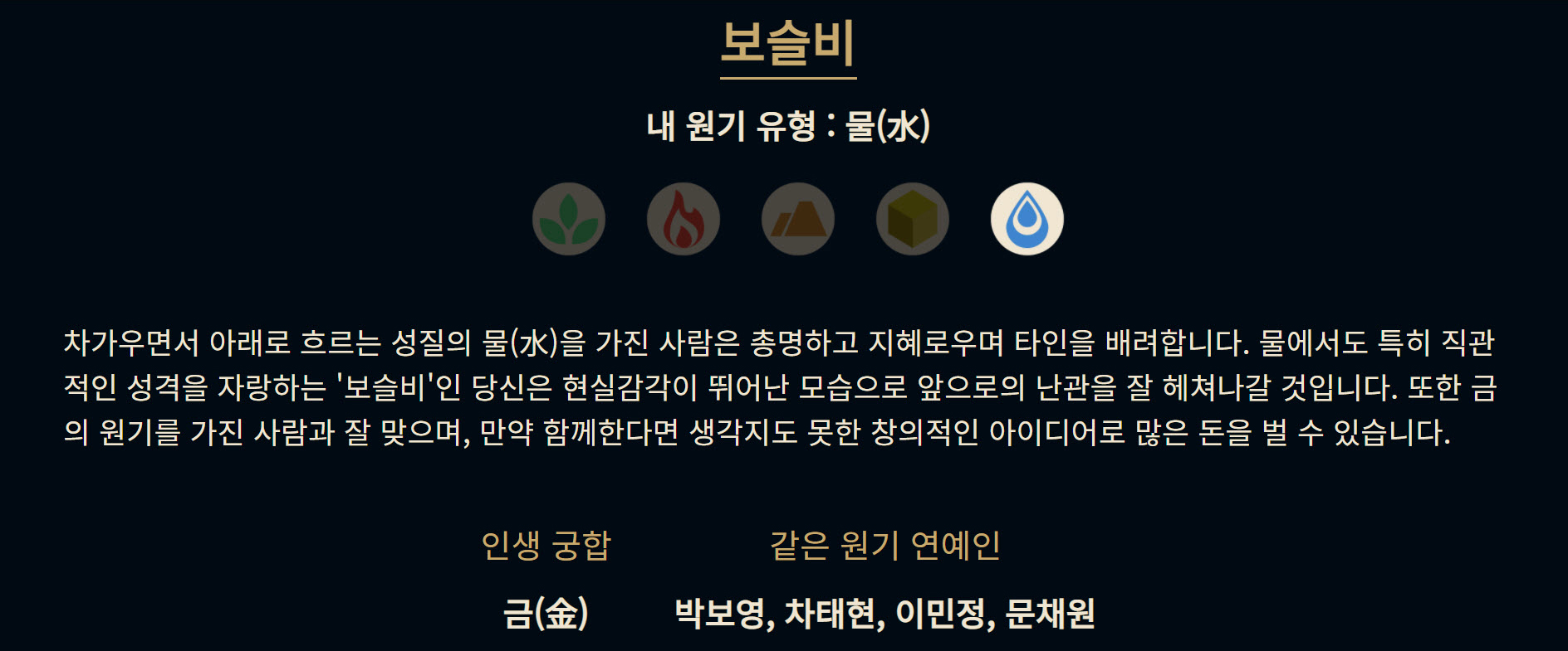 제 원기 유형은 물이 나왔습니다. 총명하고 지혜롭진 못하지만 타인의 배려심은 맞습니다. 난관을 잘 헤쳐나갈 것이라는 말이 저를 위로해 주는 것 같습니다. 또한 저는 금의 원기를 가진 사람과 잘 맞다고 하네요. 황금같은 연예인분들이 검색되어 제 기분을 더욱 좋게 해주는 것 같습니다.