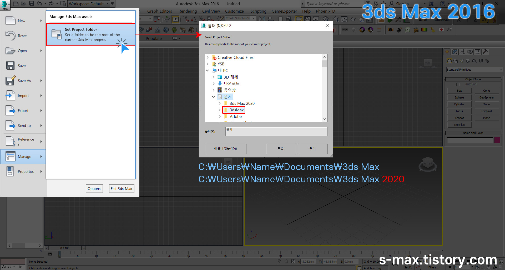 셋프로젝트폴더는 3dmax를 설치했다면 셋프로젝트폴더는 이미 셋팅되어 있습니다.