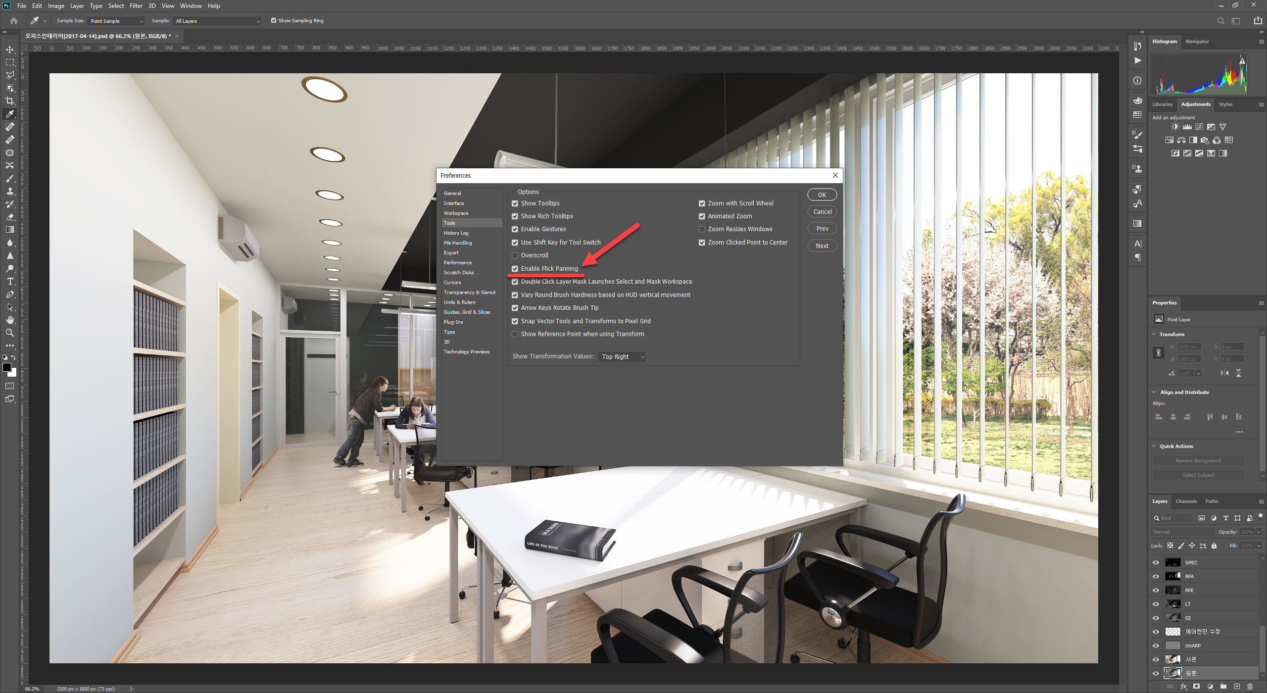 2. Tools 탭에서 Enable Flick Panning 선택 해제